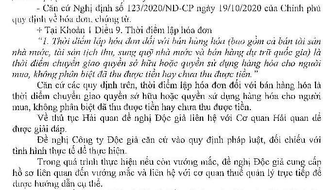Kính gửi Bộ Tài chính và Cơ quan Thuế. Doanh nghiệp (viết tắt là DN) của tôi là doanh nghiệp chế xuất, nên theo quy định tại Khoản 50 Điều 1 Thông tư 39/2018/TT-BTC: Với hàng hóa là vật liệu xây dựng thì DN chế xuất và đối tác chế xuất được phép lựa chọn làm thủ tục hải quan hay không. Với trường hợp cả DN tôi và phía nhà cung cấp của tôi lựa chọn mở tờ khai với hàng hóa vật liệu xây dựng. Thời điểm mở hải quan đầu nhập phải có hóa đơn GTGT của bên bán, tuy nhiên ngày hóa đơn phải trùng với ngày ký biên bản nghiệm thu giữa 2 bên. Vậy trong trường hợp này thì thời điểm xuất hóa đơn GTGT của bên đối tác DN chế xuất là thời điểm nào? Kính mong BTC và CQT giải đáp vướng mắc của DN để DN thực hiện đúng chính sách quy định. Trân trọng!