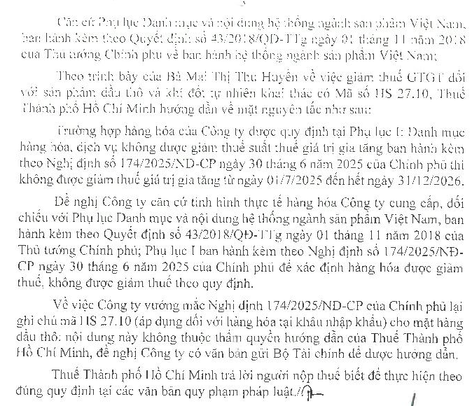 Xin chào anh chị Bộ Tài chính. Hiện tại công ty chúng tôi đang nhập số lượng lớn sản phẩm dầu chế biến, có nguồn gốc từ dầu mỏ, nhưng không phải là dầu thô. Công ty có vướng mắc về thuế GTGT quy định tại 174/2025/NĐ-CP (30/6/2025). Tại Phụ lục I của Nghị định này có ghi chú mã HS 2710 tại mặt hàng "Dầu thô và khí đốt tự nhiên khai thác". Trong khi tại mô tả hàng hóa tại biểu thuế xuất nhập khẩu cho ms4 HS 2710 như sau "Dầu có nguồn gốc từ dầu mỏ và các loại dầu thu được từ các khoáng bi-tum, trừ dầu thô; các chế phẩm chưa được chi tiết hoặc ghi ở nơi khác, có chứa hàm lượng từ 70% trở lên là dầu có nguồn gốc từ dầu mỏ hoặc các loại dầu thu được từ các khoáng bi-tum, những loại dầu này là thành phần cơ bản của các chế phẩm đó; dầu thải. (SEN) ", mô tả ghi rõ là "trừ dầu thô". Công ty muốn Quý Bộ làm rõ tại sao Nghị định 174/2025/NĐ-CP lại ghi chú mã HS 2710 cho mặt hàng dầu thô tại Phụ lục I. Xin cám ơn!