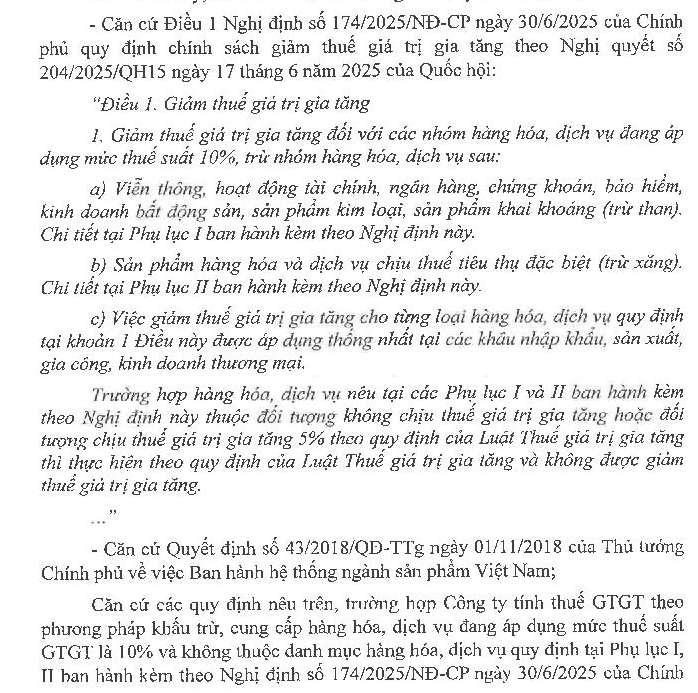 Hỏi:Kính gửi: Bộ Tài chính Chúng tôi, Công ty TNHH TM-SX Cơ Khí Cao Gia Phát MST: 3604011948. Chúng tôi muốn được giải đáp liên quan đến giảm thuế GTGT, căn cứ Nghị định 174/2025/NĐ-CP ngày 30/06/2025 của Chính phủ quy định giảm thuế giá trị gia tăng đối với các nhóm hàng hóa, dịch vụ đang áp dụng mức thuế suất 10%, trừ nhóm hàng hóa, dịch vụ được liệt kê ở Phụ lục I, II, III được ban hành kèm theo Nghị định. Hiện nay, Công ty chúng tôi đang sản xuất, gia công các mặt hàng thành phẩm từ sắt, thép tấm, thép không gỉ (inox). Vậy đối với hàng hóa đã làm ra thành phẩm từ sắt, thép tấm, thép không gì của Công ty chúng tôi thuộc đối tượng áp dụng mức thuế suất thuế GTGT 10% hay được áp dụng mức thuế suất thuế GTGT 8% theo Nghị định số 174/2025/NĐ-CP ngày 30/06/2025.
