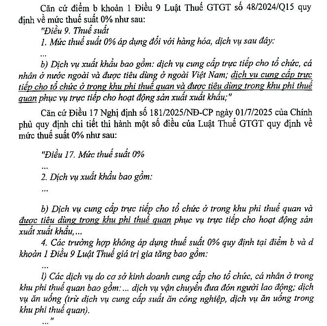 Kính đề nghị: Quý Cục xem xét, hướng dẫn chính thức, bằng văn bản về việc áp dụng mức thuế suất GTGT 0% đối với dịch vụ vận chuyển cung cấp cho DNCX (vận chuyển từ DNCX đến cảng/sân bay/khu chế xuất khác và chiều ngược lại), cụ thể thống nhất xác nhận: dịch vụ vận chuyển này có thuộc trường hợp dịch vụ xuất khẩu được áp dụng 0% hay không ( loại trừ dịch vụ đưa đón lao động như đã hướng dẫn ), kể cả khi tuyến vận chuyển diễn ra ngoài khu phi thuế quan (từ ranh giới khu phi thuế quan đến cửa khẩu (cảng, sân bay…). Đề nghị trả lời rõ ràng để doanh nghiệp thực hiện nhất quán và chính xác việc kê khai, xuất hóa đơn đồng thời đảm bảo tính cạnh tranh công bằng .
