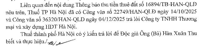 Công ty chúng tôi có nhận được Quyết định số 5232/QĐ-UBND ngày 24/11/2020 về việc thu hồi 2.337m2 đất tại phường Phú Thượng, quận Tây Hồ của UBND TP Hà Nội; giao cho Công ty chúng tôi thuê để thực hiện dự án xây dựng bãi đỗ xe tĩnh. Từ đó đến nay công ty chúng tôi nhiều lần liên hệ với Sở Tài nguyên Môi trường làm các thủ tục thuê đất (Xác định giá đất, Hợp đồng thuê đất và Giao đất tại thực địa) nhưng không được giải quyết. Đến tháng 09/2025 Cơ quan Thuế ra thông báo số 16894/TB-HAN-QLĐ ngày 18/09/2025 với số tiền thuê đất phải nộp là 9,2 tỷ đồng tính từ ngày 24/11/2020. Công ty chúng tôi xin hỏi: Khi UBND Thành phố chưa ban hành giá đất cụ thể, chưa được ký hợp đồng thuê đất, bàn giao đất tại thực địa và chưa được sử dụng đất, thì công ty chúng tôi phải nộp tiền thuê đất trong thời gian này hay không?