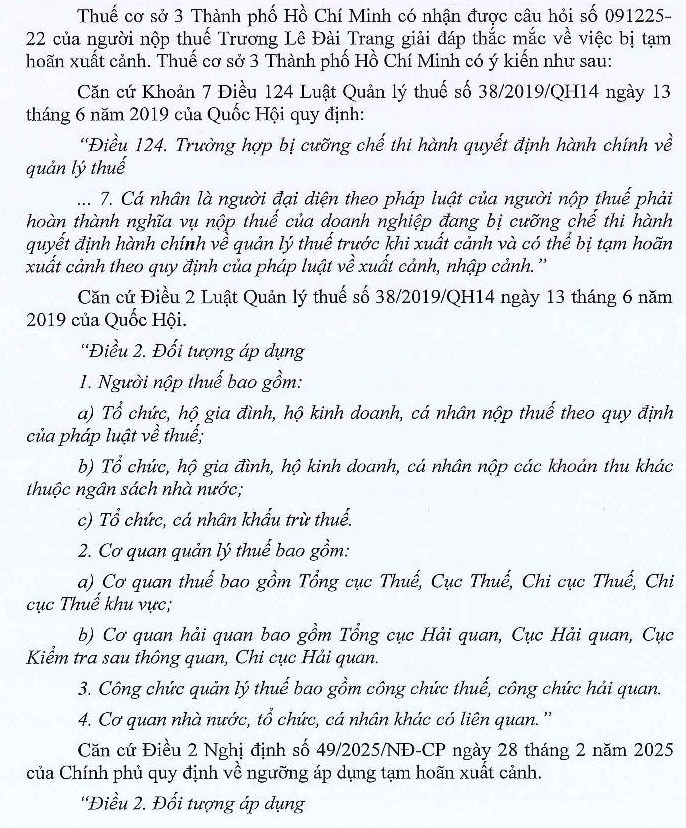 Theo Điều 2, Nghị định 49/2025/NĐ-CP về quy định về ngưỡng áp dụng tạm hoãn xuất cảnh, trong đó không nhắc đến việc người đại diện pháp luật của Văn phòng đại diện thuộc đối tượng áp dụng.