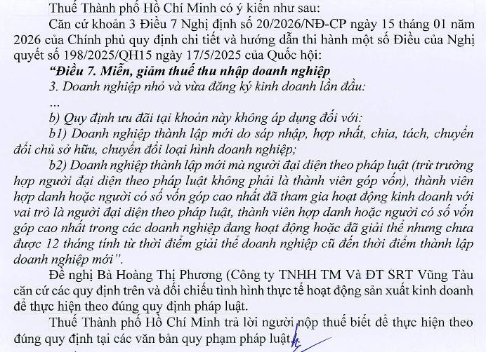 Kính gửi: Bộ Tài Chính Công ty chúng tôi xin trình bày và kính đề nghị Quý Cơ quan hướng dẫn như sau: 1. Thông tin về doanh nghiệp • Tên doanh nghiệp: Công ty TNHH TM Và ĐT SRT Vũng Tàu • Mã số thuế: 3502539672 • Ngày cấp Giấy chứng nhận đăng ký doanh nghiệp lần đầu: 07/03/2025 • Vốn điều lệ: 3.000.000.000 đồng 2. Cơ cấu góp vốn • Công ty SRT Miền Nam: góp 1.800.000.000 đồng (60%) • Ông Trương Minh Vương: góp 1.200.000.000 đồng (40%) (Đồng thời ông Vương là người đại diện theo pháp luật của công ty) Ngày 23/04/2025, công ty thực hiện đăng ký thay đổi Giấy chứng nhận đăng ký doanh nghiệp lần thứ 1, với nội dung thay đổi thành viên góp vốn, cụ thể: • Ông Trương Minh Vương góp 1.200.000.000 đồng (40%) • Ông Nguyễn Hà Quang Đức: góp 720.000.000 đồng (24%) • Ông Bùi Đăng Nghĩa: góp 540.000.000 đồng (18%) • Ông Trần Thanh Hùng: góp 540.000.000 đồng (18%) Ông Trương Minh Vương là người đại diện theo pháp luật của công ty Căn cứ quy mô nêu trên, công ty thuộc doanh nghiệp nhỏ và vừa theo quy định của pháp luật hiện hành. 3. Quy mô hoạt động năm 2025 • Doanh thu: 26.5 tỷ đồng • Số lao động tham gia BHXH: 44 người 4. Nội dung vướng mắc Căn cứ Nghị quyết số 198/2025/QH15 của Quốc hội về một số cơ chế, chính sách đặc biệt phát triển kinh tế tư nhân, trong đó quy định doanh nghiệp nhỏ và vừa đăng ký kinh doanh lần đầu được miễn thuế thu nhập doanh nghiệp trong 03 năm kể từ năm đầu được cấp Giấy chứng nhận đăng ký doanh nghiệp Nghị đinh số: 20/2026/NĐ-CP ƯU ĐÃI VỀ THUẾ tại: Điều 7. Miễn, giảm thuế thu nhập doanh nghiệp khoản 3. Doanh nghiệp nhỏ và vừa đăng ký kinh doanh lần đầu Doanh nghiệp thành lập mới mà người đại diện theo pháp luật (trừ trường hợp người đại diện theo pháp luật không phải là thành viên góp vốn), thành viên hợp danh hoặc người có số vốn góp cao nhất đã tham gia hoạt động kinh doanh với vai trò là người đại diện theo pháp luật, thành viên hợp danh hoặc người có số vốn góp cao nhất trong các doanh nghiệp đang hoạt động hoặc đã giải thể nhưng chưa được 12 tháng tính từ thời điểm giải thể doanh nghiệp cũ đến thời điểm thành lập doanh nghiệp mới; Tuy nhiên, do: • Doanh nghiệp có cổ đông góp vốn Công ty TNHH TM và ĐT SRT Miền Nam – 60% • Người đại diện theo pháp luật là cá nhân góp vốn 40%; Do đó, doanh nghiệp chúng tôi chưa xác định rõ trường hợp nêu trên có được xác định là doanh nghiệp nhỏ và vừa đăng ký kinh doanh lần đầu để được hưởng ưu đãi miễn thuế thu nhập doanh nghiệp theo quy định tại Nghị quyết số 198/2025/QH15 và Nghị định số 20/2026/NĐ-CP hay không. 5. Kiến nghị Kính đề nghị bộ tài chính xem xét và hướng dẫn bằng văn bản để doanh nghiệp chúng tôi có cơ sở thực hiện đúng quy định pháp luật về thuế, tránh rủi ro trong quá trình kê khai, quyết toán thuế thu nhập doanh nghiệp. Công ty xin cam kết các thông tin nêu trên là đúng sự thật và hoàn toàn chịu trách nhiệm trước pháp luật. Rất mong nhận được sự hướng dẫn.