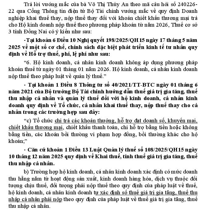 Kính Gửi Bộ Tài Chính. Công ty em sản xuất thức ăn chăn nuôi, thuế GTGT là KCT, Công Ty có ký kết thỏa thuận chi trả chiết khấu thương mại hàng tháng cho cá nhân kinh doanh/ hộ kinh doanh (có vài cá nhân kinh doanh chưa đăng ký hộ kinh doanh ) khi đạt sản lượng, công ty có thực hiện kê khai thay và nộp thuế TNCN thay theo tờ khai mẫu số 01/CNKD TT40/2021 Hàng tháng Công ty đã kê khai và nộp thuế thay đều được, tuy nhiên năm 2026 xóa bỏ hộ khoán, em chưa rõ là công ty có phải kê khai và nộp thuế thay hàng tháng nữa không, hay chuyển sang kê khai theo quý/ năm ạ vì kế từ kỳ thuế tháng 01/2026 không nộp được tờ khai này như những năm trước được nữa. Em xin trân trọng cảm ơn.