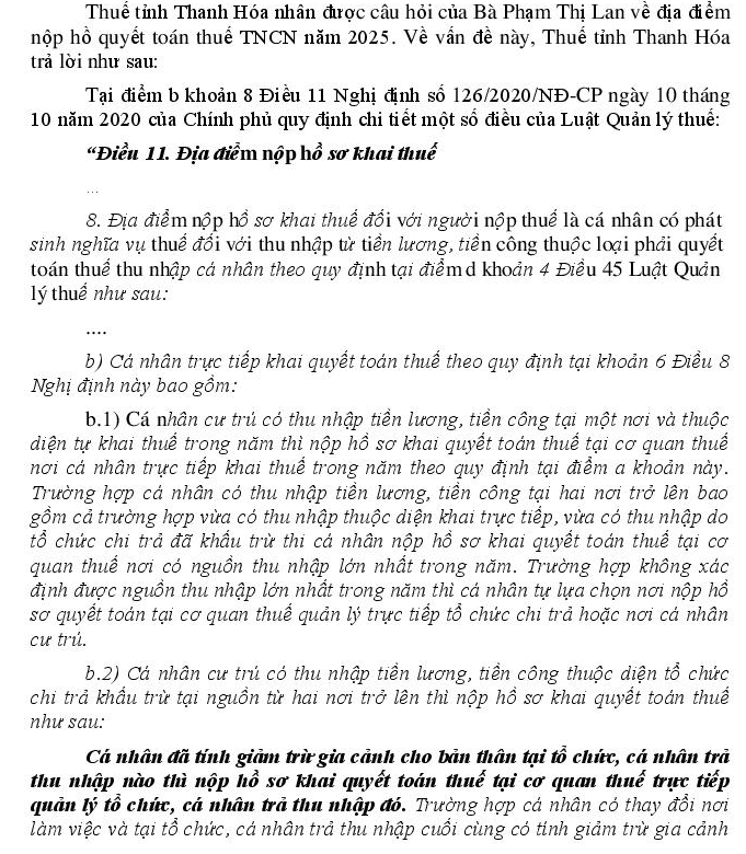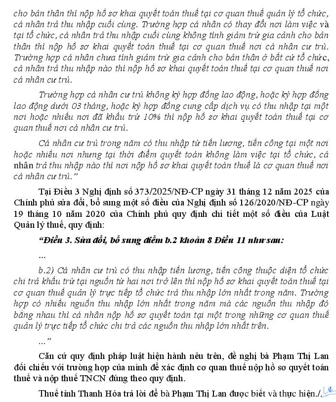 Kính gửi Bộ Tài Chính, Liên quan đến việc quyết toán thuế TNCN năm 2025 cho cá nhân tự quyết toán, tôi có một vấn đề xin Bộ Tài Chính giúp giải đáp như sau: Đối với cá nhân có nhiều nguồn thu nhập tại nhiều tổ chức chi trả thu nhập và các tổ chức chi trả thu nhập không cùng một tỉnh thành. Cá nhân trong năm không tự kê khai thuế mà do các tổ chức chi trả thu nhập kê khai và khấu trừ thuế. Cuối năm cá nhân tự quyết toán thuế TNCN theo tờ khai 02/QT-TNCN, cá nhân có địa chỉ cư trú tại tỉnh A và tại tỉnh thành A có 30 nguồn thu nhập tại các tổ chức chi trả thu nhập và thu nhập tại mỗi tổ chức là 100tr/năm. Ngoài ra công ty cá nhân có 05 nguồn thu nhập tại tỉnh thành B và có thu nhập tại một tổ chức tại tỉnh thành B là 600tr/năm (có đóng bảo hiểm và giảm trừ bản thân, không có người phụ thuộc). Vậy xin hỏi, cá nhân này sẽ phải nộp tờ khai quyết toán thuế TNCN tờ khai mẫu 02/QT-TNCN và nộp thuế TNCN cho cơ quan thuế tại tỉnh thành A hay là tỉnh thành B? Rất mong được Bộ Tài Chính giải đáp, xin cảm ơn!