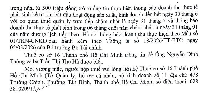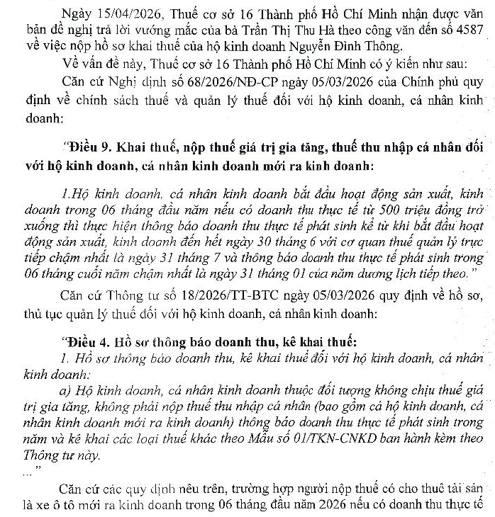 Kính gửi Bộ Tài Chính. Tôi có câu hỏi vướng mắc xin được giải đáp như sau. Trong năm 2026 tôi có tài sản cho thuê tài sản là xe oto (35tr/tháng từ tháng 03.2026. tổng doanh thu năm 2026 là 350.000.000đ. Theo quy định Thời hạn nộp hồ sơ khai thuế đối với cá nhân khai thuế một lần theo năm chậm nhất là ngày cuối cùng của tháng đầu tiên của năm dương lịch tiếp theo. Tuy nhiên đến khi đăng nhập vào https://dichvucong.gdt.gov.vn để tiến hành khai thuế thì tờ khai sẽ có hai mẫu là mẫu tờ khai 01/CNKD - Tờ khai thuế đối với hộ kinh doanh, cá nhân kinh doanh (TT18/2026) và mẫu 01/TKN-CNKD - Tờ khai thuế đối với cá nhân kinh doanh (Khai thuế năm đối với cá nhân trực tiếp ký hợp đồng làm đại lý xổ số, đại lý bảo hiểm, đại lý bán hàng đa cấp và hoạt động kinh doanh khác) nhưng lại theo mẫu Thông tư số 40/2021. Khi tôi thực hiện thao tác khai thuế trên mẫu tờ khai 01/CNKD - Tờ khai thuế đối với hộ kinh doanh, cá nhân kinh doanh (TT18/2026) thử. Thì trên tờ khai 01/CNKD thì chỉ hiện tờ khai thuế theo kỳ tính thuế theo tháng, quý hoặc theo từng lần phát sinh. Mà không hiện kỳ tính thuế theo năm. Đồng thời khi nhập doanh thu trực tiếp doanh thu vào đó thì hệ thống tự động nhảy ra số tiền thuế phải nộp của tôi, trong khi với mức doanh thu 350.000.000đ/năm của tôi không thuộc diện nộp thuế. Nhưng tôi lại không chỉnh sửa được số tiền thuế phải nộp khi hệ thống nhảy số liệu ra. Kính mong Bộ Tài chính hướng dẫn tôi thực hiện việc kê khai thuế cho thuê tài sản (cho thuê xe oto) theo mẫu tờ khai nào và kê khai theo tháng/quý hay lần phát sinh là là đúng quy định hiện hành. Xin trân trọng cảm ơn
